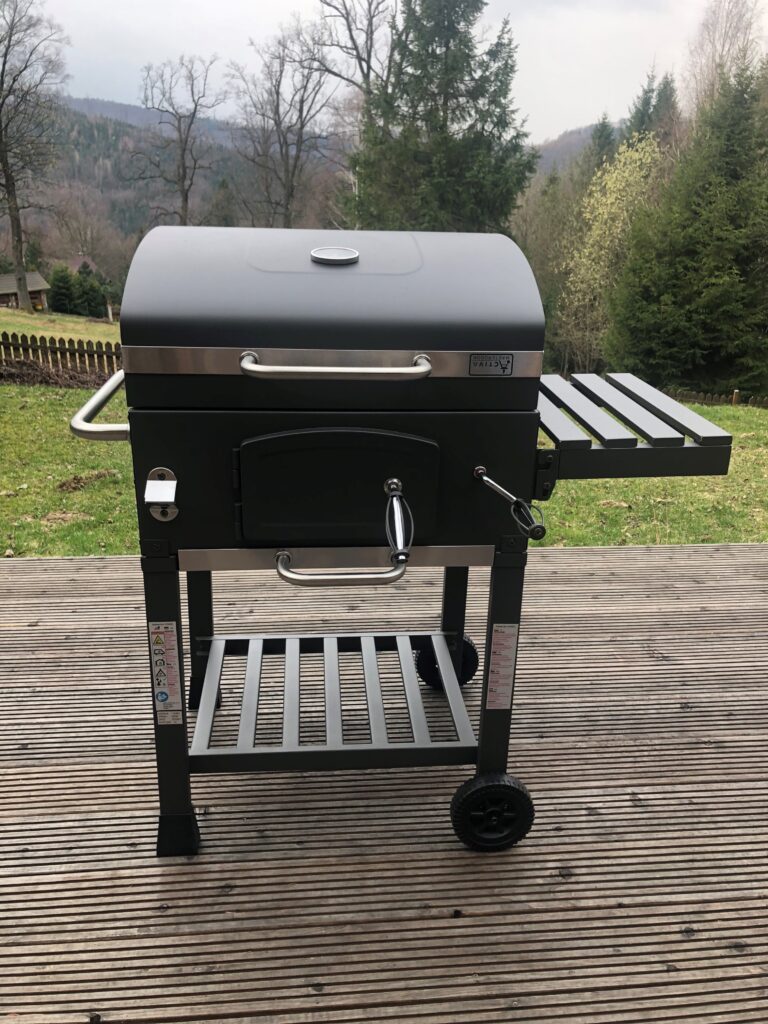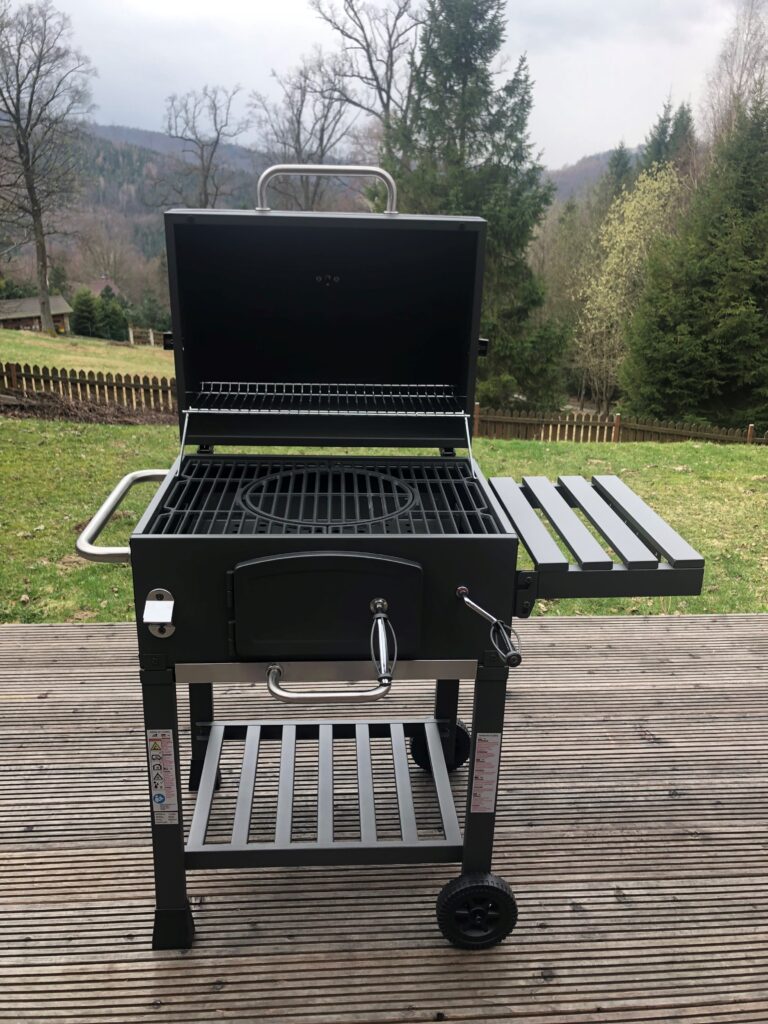 Na tarasie znajduje się stół. Nad tarasem można rozwinąć markizę, sterowaną pilotem, pozwalającą na uzyskanie dodatkowego zacienienia. W domu znajduje się również duży grill na węgiel drzewny, wyposażony w żeliwny ruszt i ruchome palenisko.